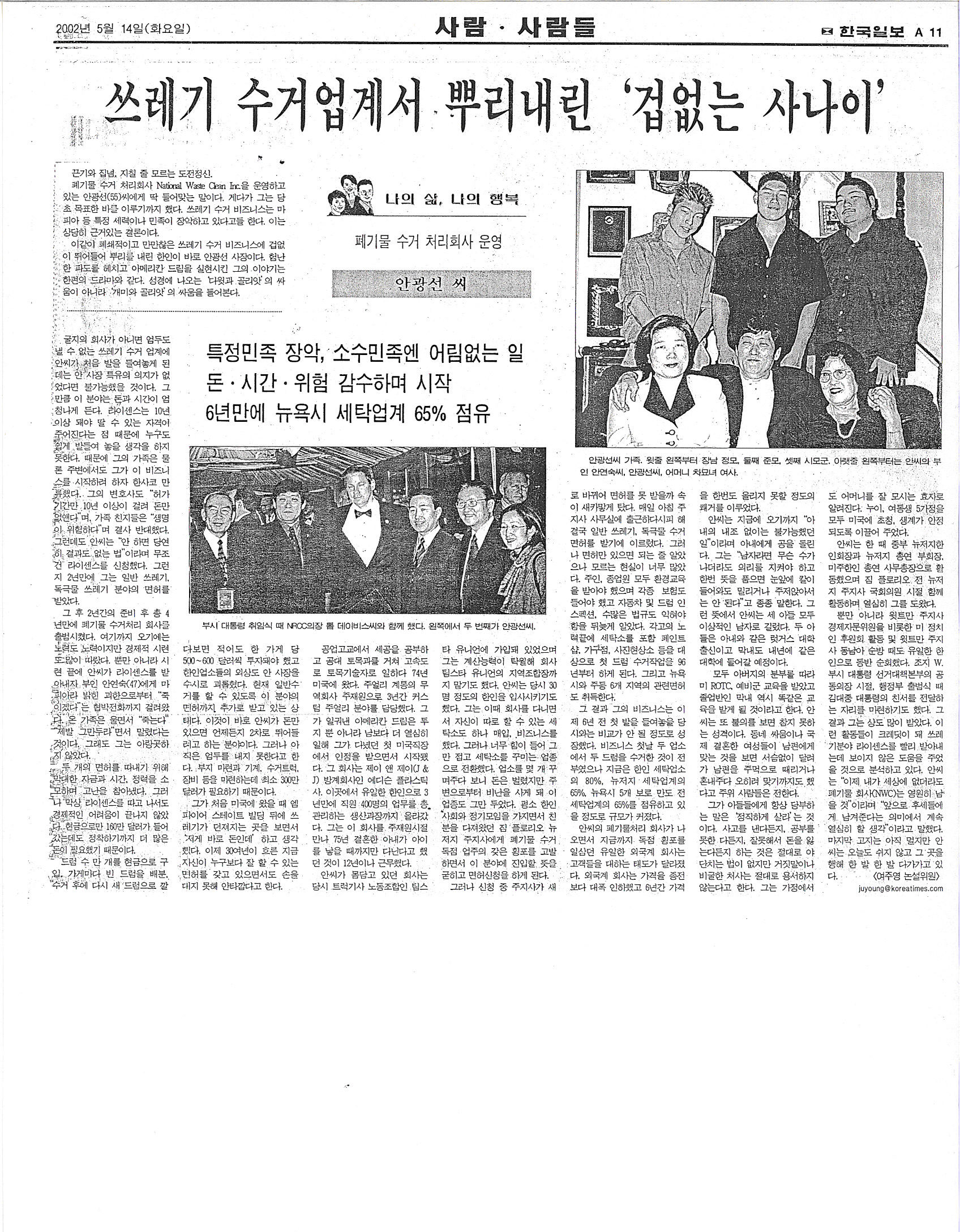 끈기와 집념, 지칠 줄 모르는 도전정신. 폐기물 수거 처리회사 National Waste Clean Inc.을 운영하고 있는 안광선씨에게 딱 들어맞는 말이다. 게다가 그는 당초 목표한 바를 이루기까지 했다. 쓰레기 수거 비즈니스는 마피아 등 특정 세력이나 민족이 장악하고 있다고들 한다. 이는 상당히 근거있는 결론이다. 이같이 폐쇄적이고 만만찮은 쓰래기 수거 비즈니스에 겁없이 뛰어 들어 뿌리를 내린 한인이 바로 안광선 사장이다. 험난한 파도를 헤치고 아메리칸 드림을 실현시킨 그의 이야기는 한편의 드라마와 같다. 성경에 나오는 "다윗과 골리아"의 싸움이 아니라 "개미와 골리앗"의 싸움을 들어본다.